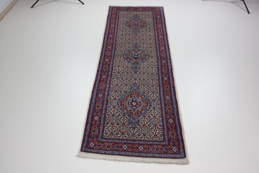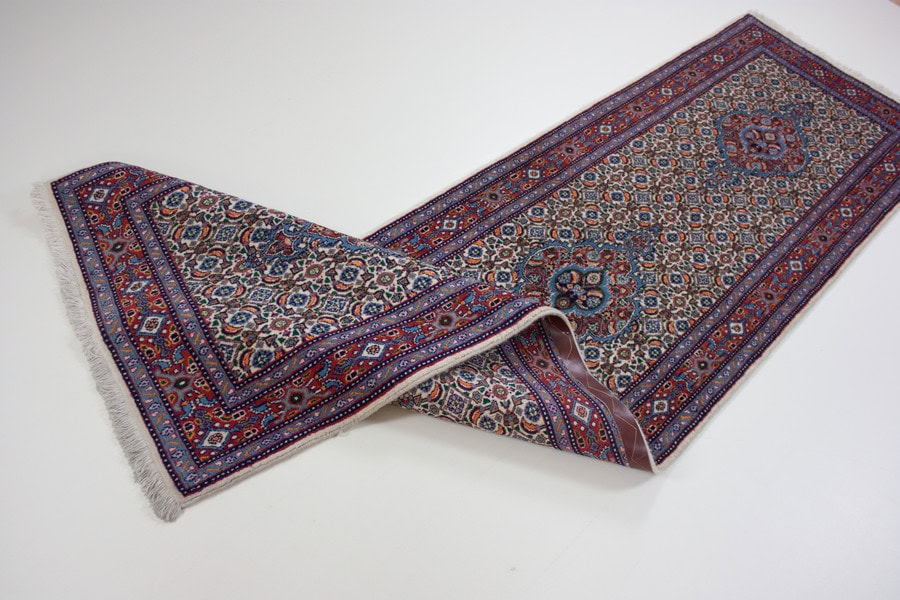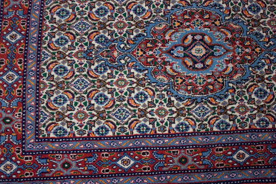 Die besten und schönsten Mescheder Teppiche werden als Moud bezeichnet. Sie zeichnen sich vorallem durch besonders feine Knüpfung, einen glatt geschorenen, dichten mittelhohen Flor sowie durch das sehr klar gezeichnete, reiche Medaillon- und Ranken-Blüten-Muster mit harmonischen Farben aus. Die Moud-Teppiche haben eine ausgesuchte, vorzügliche Knüpfwolle mit Glanz und eine feste aber biegsame Struktur. Das Grundgewebe besteht aus dünn gesponnenem Baumwollgarn. Die Knüpfungsdichte ereicht oft die 400.000 persischen Knoten pro Quadratmeter.
