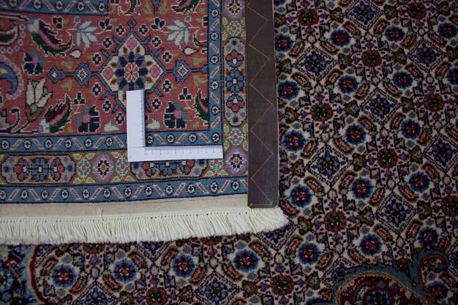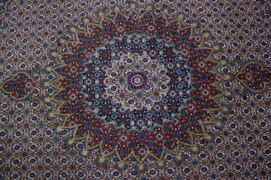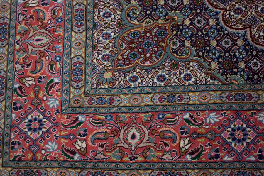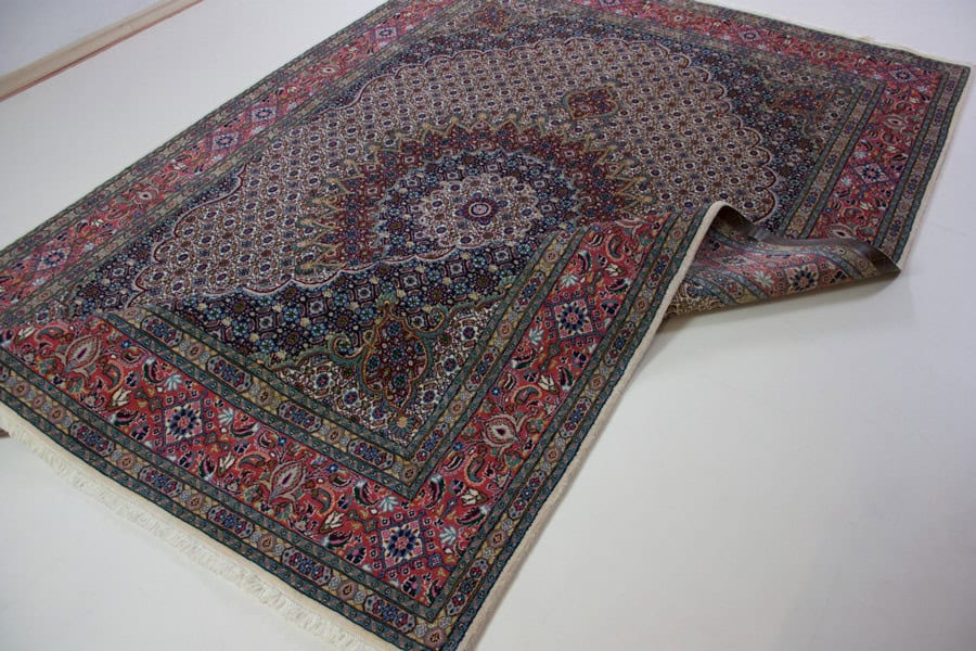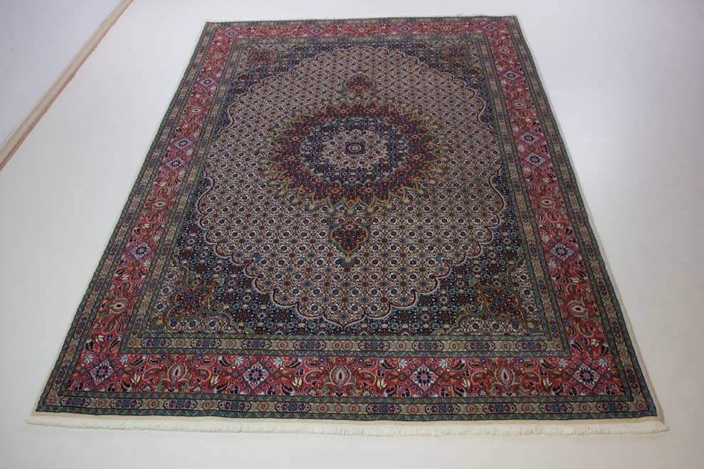 Die besten und schönsten Mescheder Teppiche werden als Moud bezeichnet. Sie zeichnen sich vorallem durch besonders feine Knüpfung, einen glatt geschorenen, dichten mittelhohen Flor sowie durch das sehr klar gezeichnete, reiche Medaillon- und Ranken-Blüten-Muster mit harmonischen Farben aus. Die Moud-Teppiche haben eine ausgesuchte, vorzügliche Knüpfwolle mit Glanz und eine feste aber biegsame Struktur. Das Grundgewebe besteht aus dünn gesponnenem Baumwollgarn. Die Knüpfungsdichte ereicht oft die 400.000 persischen Knoten pro Quadratmeter.