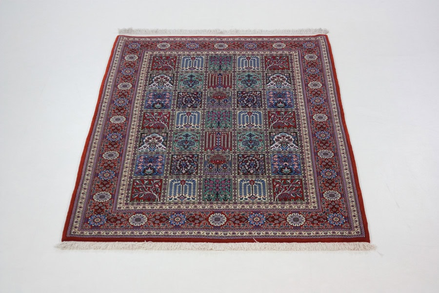 und Blattarabesken erinnern an die Muster der alten Seldschuken-Teppiche. In der Feldeinteilung sehen wir Trauerweiden, Blütenstauden, Botah-Motive und kleine Gebetnischen als Füllung. Die Längsbahnen der Steifeneinteilung enthalten. Wellenranken, die mit Botahs als Blüten besetzt sind. In der Borte werden Arabeskranken und Arabeskblätter mit Palmetten angereiht. Das Kolorit ist bunt aber weich und gedämpft. Dunkelblau und ein kräftiges violettes Rot wechseln plastisch mit den Pasteltönen von anderen Farben. Der Grund ist ziegelrot , naturweiß oder mittelblau. Die Knüpfungsdichte liegt zwischen 240.000 und 400.000 persischen Knoten