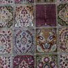 und Blattarabesken erinnern an die Muster der alten Seldschuken-Teppiche. In der Feldeinteilung sehen wir Trauerweiden, Blütenstauden, Botah-Motive und kleine Gebetnischen als Füllung. Die Längsbahnen der Steifeneinteilung enthalten. Wellenranken, die mit Botahs als Blüten besetzt sind. In der Borte werden Arabeskranken und Arabeskblätter mit Palmetten angereiht. Das Kolorit ist bunt aber weich und gedämpft. Dunkelblau und ein kräftiges violettes Rot wechseln plastisch mit den Pasteltönen von anderen Farben. Der Grund ist ziegelrot , naturweiß oder mittelblau.