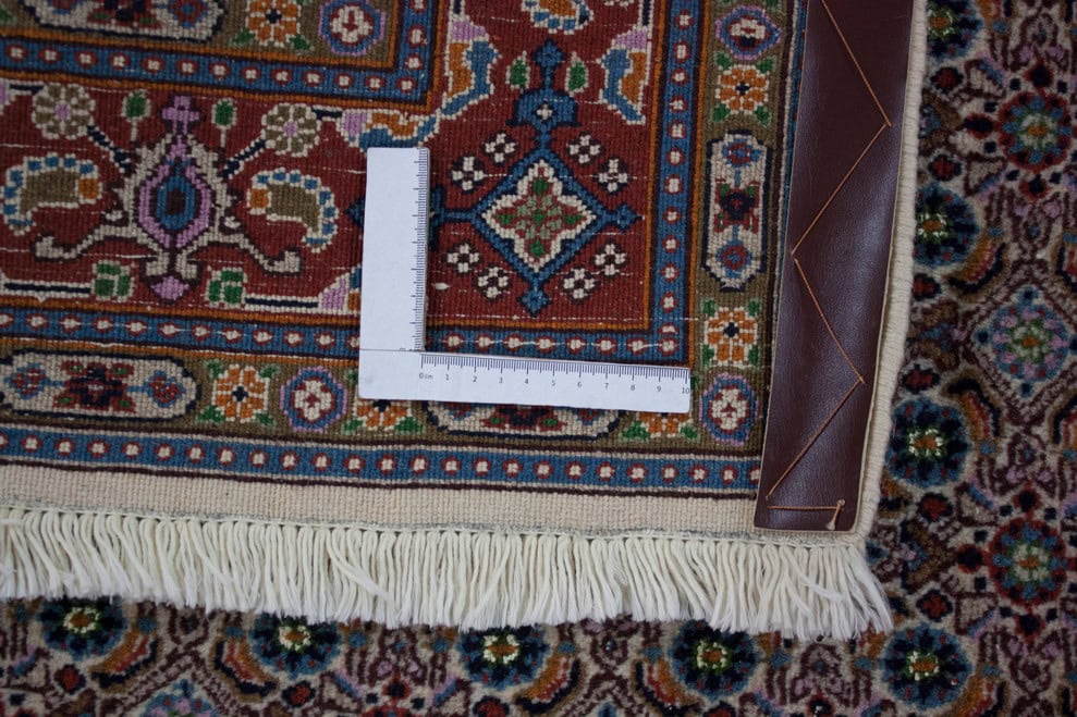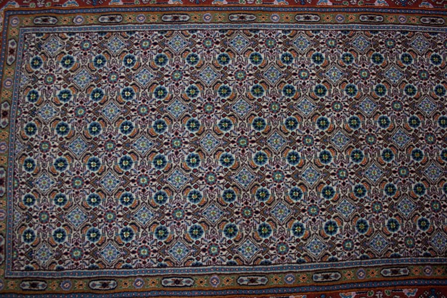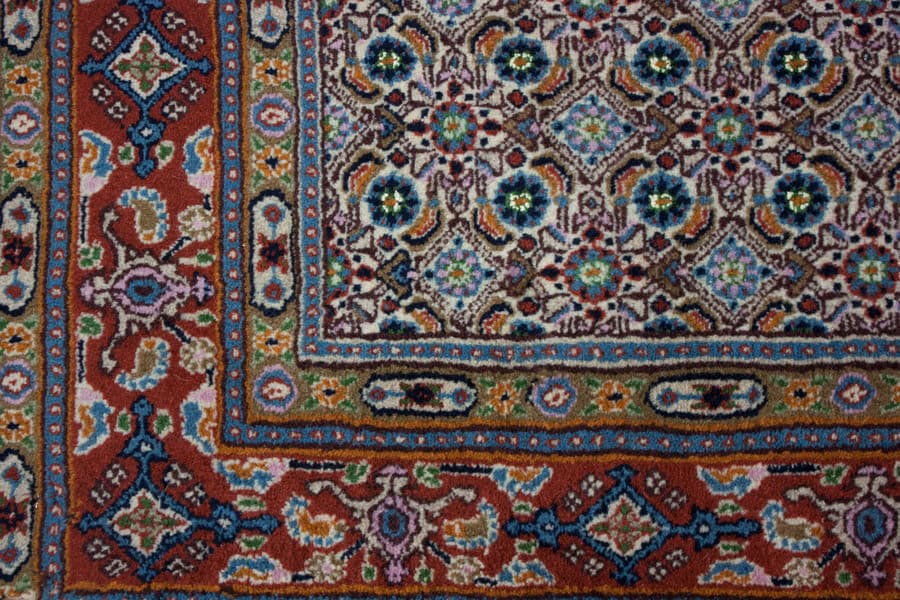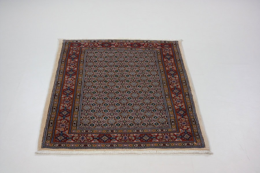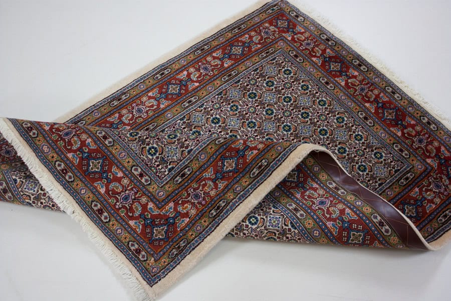 Die besten und schönsten Mescheder Teppiche werden als Moud bezeichnet. Sie zeichnen sich vorallem durch besonders feine Knüpfung, einen glatt geschorenen, dichten mittelhohen Flor sowie durch das sehr klar gezeichnete, reiche Medaillon- und Ranken-Blüten-Muster mit harmonischen Farben aus. Die Moud-Teppiche haben eine ausgesuchte, vorzügliche Knüpfwolle mit Glanz und eine feste aber biegsame Struktur. Das Grundgewebe besteht aus dünn gesponnenem Baumwollgarn. Die Knüpfungsdichte ereicht oft die 400.000 persischen Knoten pro Quadratmeter.