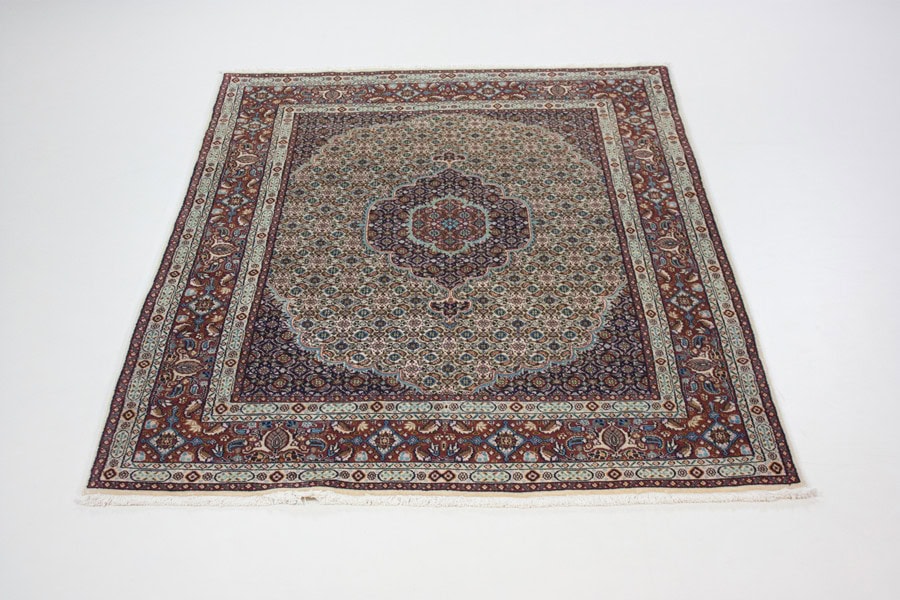 Die besten und schönsten Mescheder Teppiche werden als Moud bezeichnet. Sie zeichnen sich vorallem durch besonders feine Knüpfung, einen glatt geschorenen, dichten mittelhohen Flor sowie durch das sehr klar gezeichnete, reiche Medaillon- und Ranken-Blüten-Muster mit harmonischen Farben aus. Die Moud-Teppiche haben eine ausgesuchte, vorzügliche Knüpfwolle mit Glanz und eine feste aber biegsame Struktur. Das Grundgewebe besteht aus dünn gesponnenem Baumwollgarn. Die Knüpfungsdichte ereicht oft die 400.000 persischen Knoten pro Quadratmeter.
