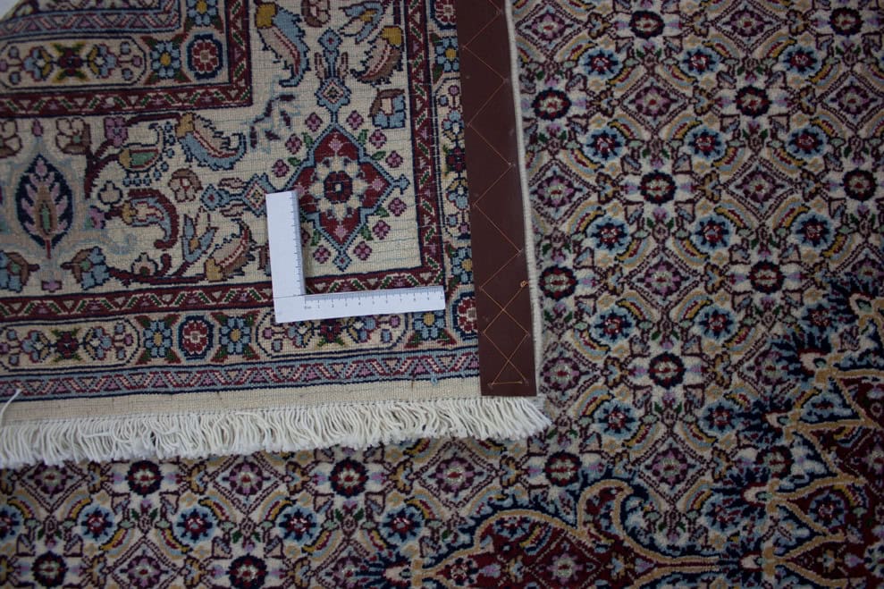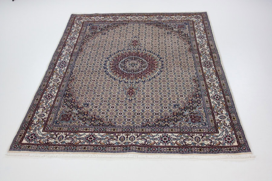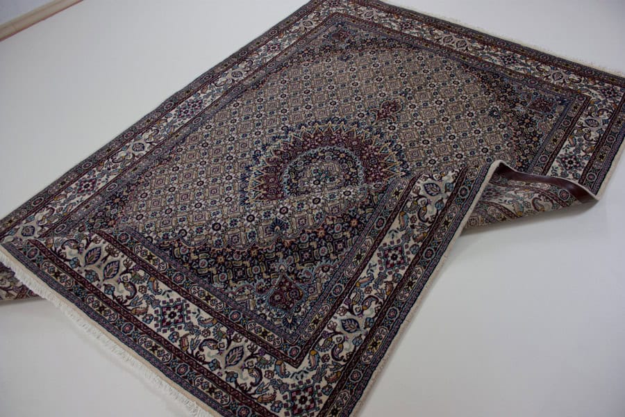 Die besten und schönsten Mescheder Teppiche werden als Moud bezeichnet. Sie zeichnen sich vorallem durch besonders feine Knüpfung, einen glatt geschorenen, dichten mittelhohen Flor sowie durch das sehr klar gezeichnete, reiche Medaillon- und Ranken-Blüten-Muster mit harmonischen Farben aus. Die Moud-Teppiche haben eine ausgesuchte, vorzügliche Knüpfwolle mit Glanz und eine feste aber biegsame Struktur. Das Grundgewebe besteht aus dünn gesponnenem Baumwollgarn. Die Knüpfungsdichte ereicht oft die 400.000 persischen Knoten pro Quadratmeter.