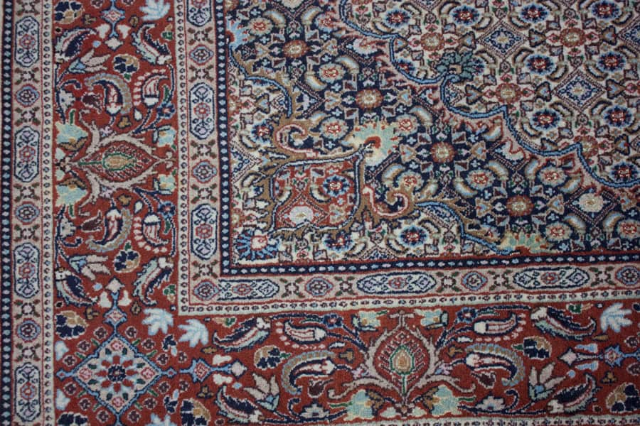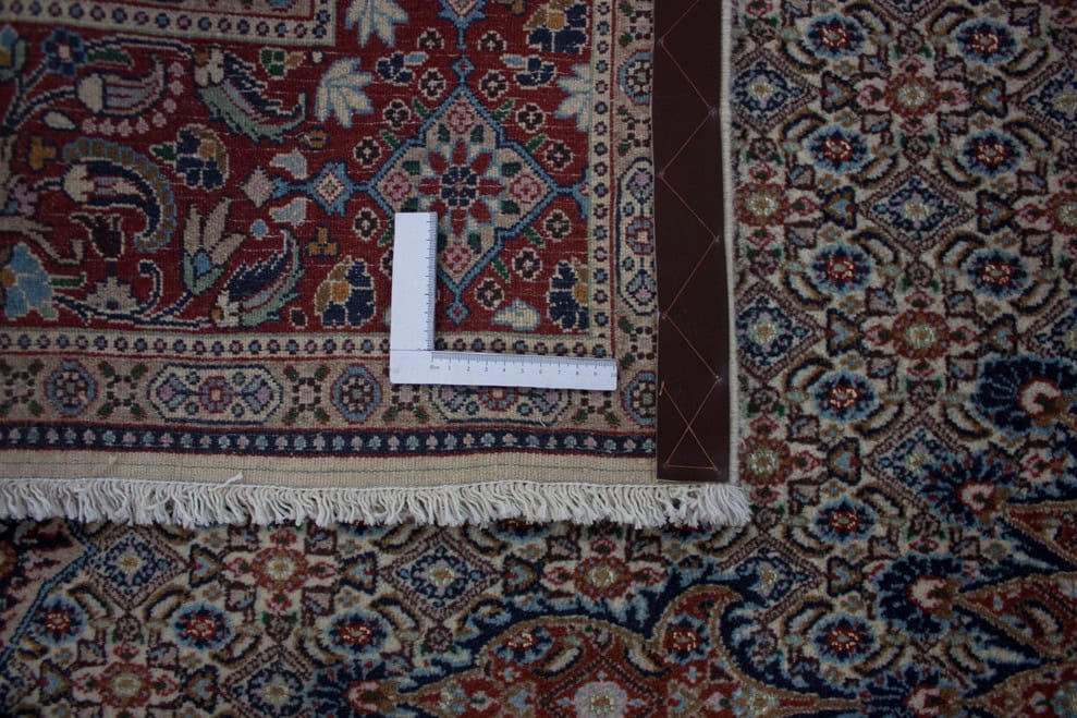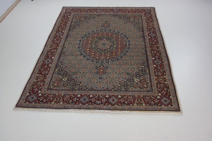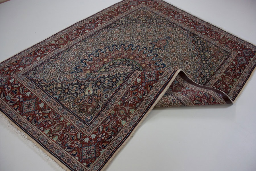 Die besten und schönsten Mescheder Teppiche werden als Moud bezeichnet. Sie zeichnen sich vorallem durch besonders feine Knüpfung, einen glatt geschorenen, dichten mittelhohen Flor sowie durch das sehr klar gezeichnete, reiche Medaillon- und Ranken-Blüten-Muster mit harmonischen Farben aus. Die Moud-Teppiche haben eine ausgesuchte, vorzügliche Knüpfwolle mit Glanz und eine feste aber biegsame Struktur. Das Grundgewebe besteht aus dünn gesponnenem Baumwollgarn. Die Knüpfungsdichte ereicht oft die 400.000 persischen Knoten pro Quadratmeter.