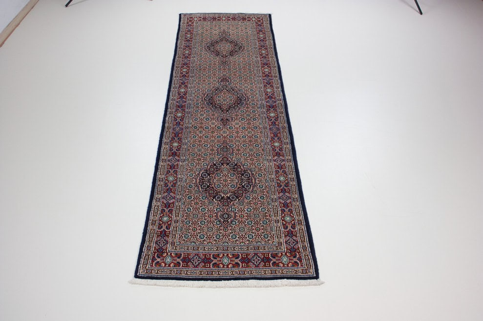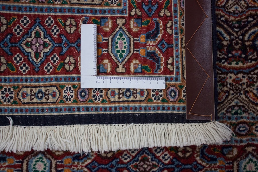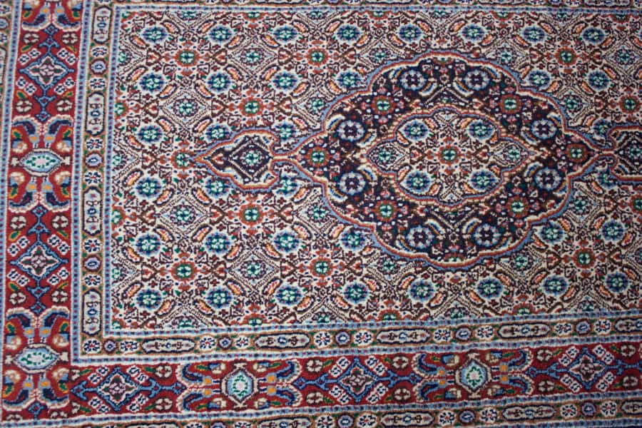 Die besten und schönsten Mescheder Teppiche werden als Moud bezeichnet. Sie zeichnen sich vorallem durch besonders feine Knüpfung, einen glatt geschorenen, dichten mittelhohen Flor sowie durch das sehr klar gezeichnete, reiche Medaillon- und Ranken-Blüten-Muster mit harmonischen Farben aus. Die Moud-Teppiche haben eine ausgesuchte, vorzügliche Knüpfwolle mit Glanz und eine feste aber biegsame Struktur. Das Grundgewebe besteht aus dünn gesponnenem Baumwollgarn. Die Knüpfungsdichte ereicht oft die 400.000 persischen Knoten pro Quadratmeter.