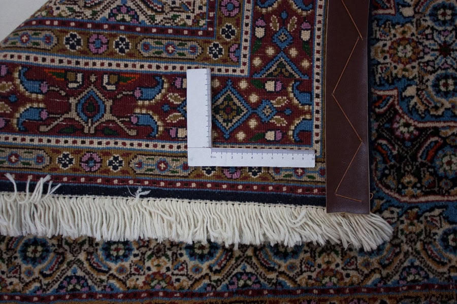 Die besten und schönsten Mescheder Teppiche werden als Moud bezeichnet. Sie zeichnen sich vorallem durch besonders feine Knüpfung, einen glatt geschorenen, dichten mittelhohen Flor sowie durch das sehr klar gezeichnete, reiche Medaillon- und Ranken-Blüten-Muster mit harmonischen Farben aus. Die Moud-Teppiche haben eine ausgesuchte, vorzügliche Knüpfwolle mit Glanz und eine feste aber biegsame Struktur. Das Grundgewebe besteht aus dünn gesponnenem Baumwollgarn. Die Knüpfungsdichte ereicht oft die 400.000 persischen Knoten pro Quadratmeter.