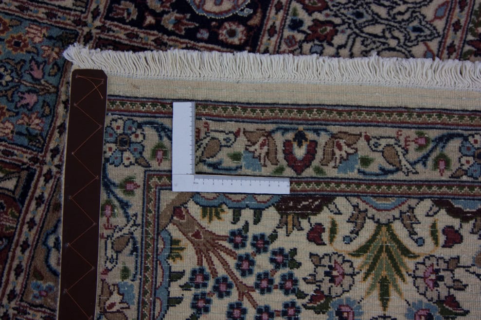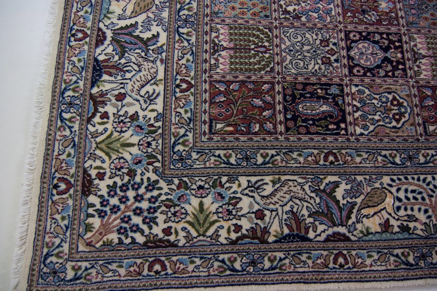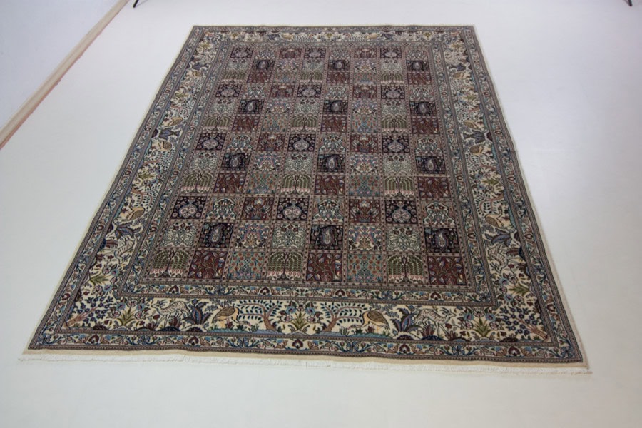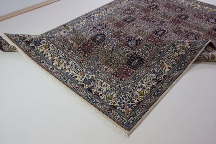 Die besten und schönsten Mescheder Teppiche werden als Moud bezeichnet. Sie zeichnen sich vorallem durch besonders feine Knüpfung, einen glatt geschorenen, dichten mittelhohen Flor sowie durch das sehr klar gezeichnete, reiche Medaillon- und Ranken-Blüten-Muster mit harmonischen Farben aus. Die Moud-Teppiche haben eine ausgesuchte, vorzügliche Knüpfwolle mit Glanz und eine feste aber biegsame Struktur. Das Grundgewebe besteht aus dünn gesponnenem Baumwollgarn. Die Knüpfungsdichte ereicht oft die 400.000 persischen Knoten pro Quadratmeter.