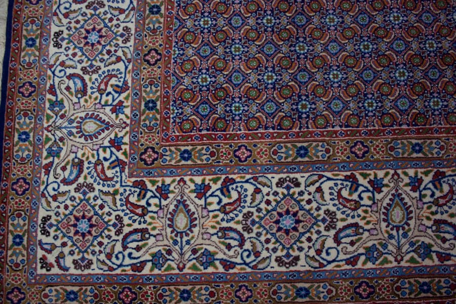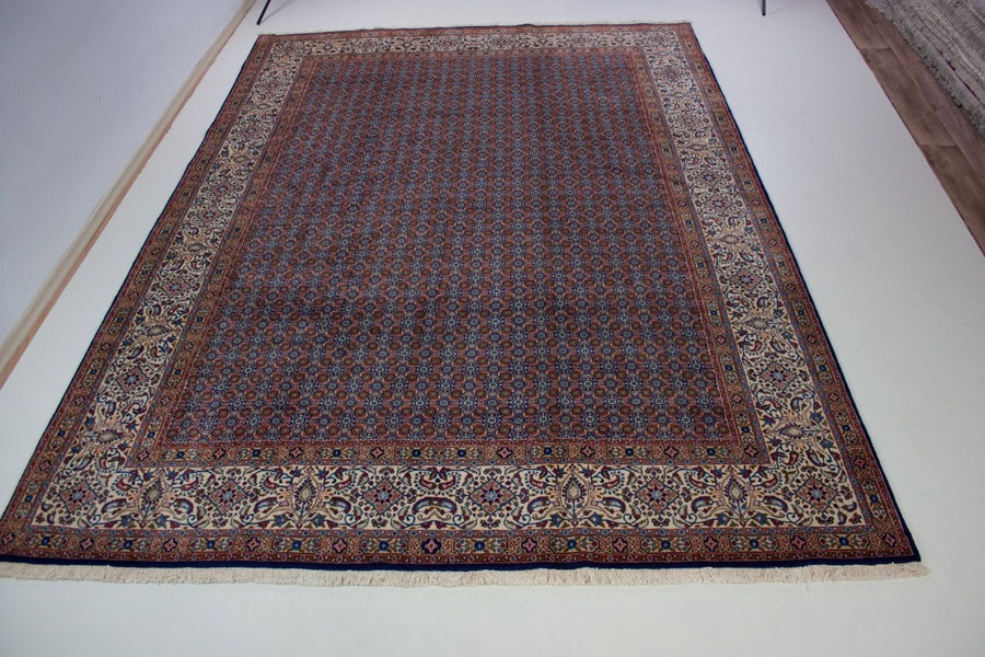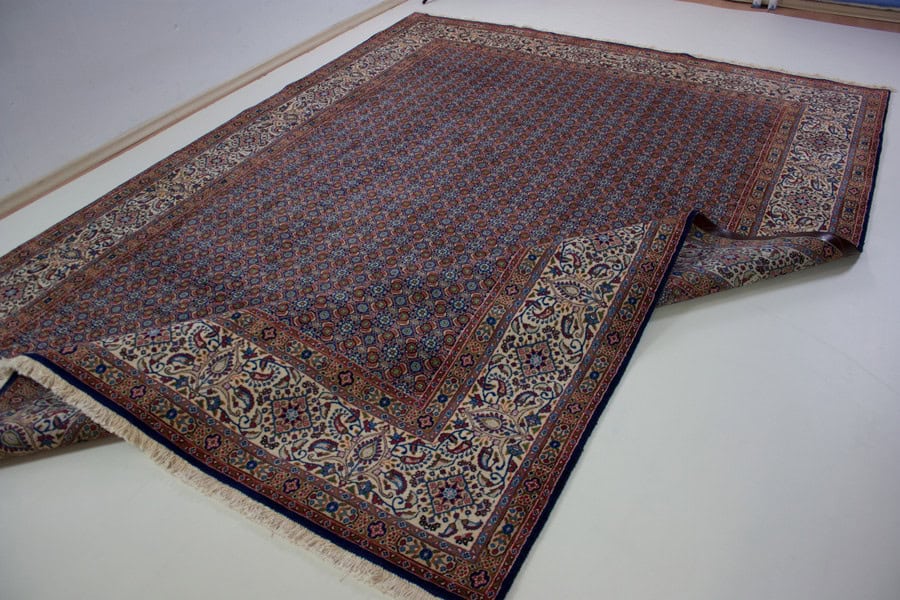 Die besten und schönsten Mescheder Teppiche werden als Moud bezeichnet. Sie zeichnen sich vorallem durch besonders feine Knüpfung, einen glatt geschorenen, dichten mittelhohen Flor sowie durch das sehr klar gezeichnete, reiche Medaillon- und Ranken-Blüten-Muster mit harmonischen Farben aus. Die Moud-Teppiche haben eine ausgesuchte, vorzügliche Knüpfwolle mit Glanz und eine feste aber biegsame Struktur. Das Grundgewebe besteht aus dünn gesponnenem Baumwollgarn. Die Knüpfungsdichte ereicht oft die 400.000 persischen Knoten pro Quadratmeter.