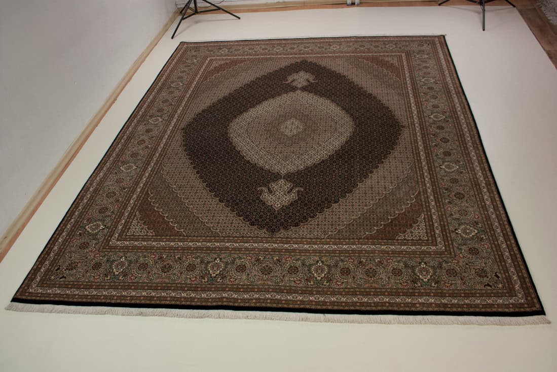 Der Ruhm dieses persischen Teppichs ist mit dem Namen der Stadt Täbris eng verbunden. Die erste Residenz der Safawiden-Dynastie und Hauptstadt Aserbaidschans ist das alte Zentrum der nordwestpersischen Teppichknüpfkunst. Von hier stammen die ältesten erhalten gebliebenen Prachtteppiche Persiens, die im 16. Jahrhundert in den Hofmanufakturen geknüpft wurden. Die klassischen Täbris-Teppiche sind vorwiegend im barocken Stil der Medaillongliederung mit verschlungenem Rankenwerk und Blüten gemustert. Verschiedene Typen haben jedoch auch unendlich fortlaufende Rapportmuster, die aus netzartig angeordneten Kartuschen und Schildern, rollenden Reihen, spiralförmiger Arabeskranken oder auch versetzt angereihten Medaillons bestehen. Das Grundgewebe besteht aus dünn gezwirntem Baumwollgarn. Die Knüpfung hat durchschnittlich 260.000 persische und türkische Knoten pro Quadratmeter